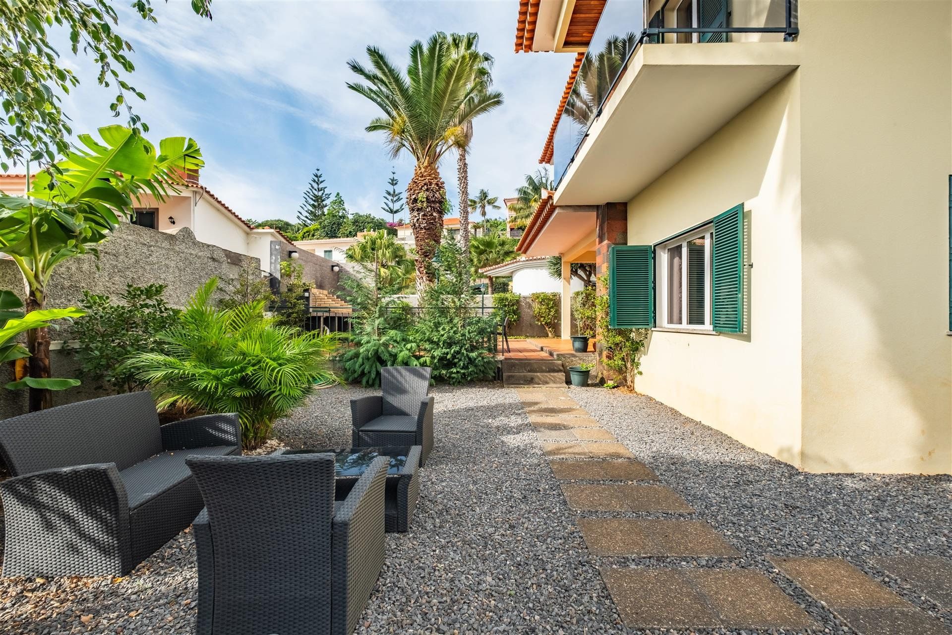 Im Obergeschoss befinden sich neben der Master-Suite zwei weitere Schlafzimmer, ein vollwertiges Badezimmer sowie ein Arbeitszimmer mit eigenem Balkon – ideal für alle, die Home-Office und mediterranes Lebensgefühl verbinden möchten. Die zentrumsnahe Lage in einer ruhigen Wohnstraße verbindet städtische Infrastruktur mit Privatsphäre. Funchal bietet nicht nur ausgezeichnete Gesundheitsversorgung und internationale Schulen, sondern auch das schnellste Internet Europas – perfekt für digitales Arbeiten. Der gepflegte Außenbereich mit Essplatz und Grillzone lädt zum Verweilen ein, und das großzügige Grundstück bietet ausreichend Raum für einen Pool. Mit vier Badezimmern und durchdachten Raumkonzepten eignet sich diese Immobilie sowohl als Hauptwohnsitz für Familien als auch als renditestarkes Ferienobjekt in einer der begehrtesten Lagen Madeiras.