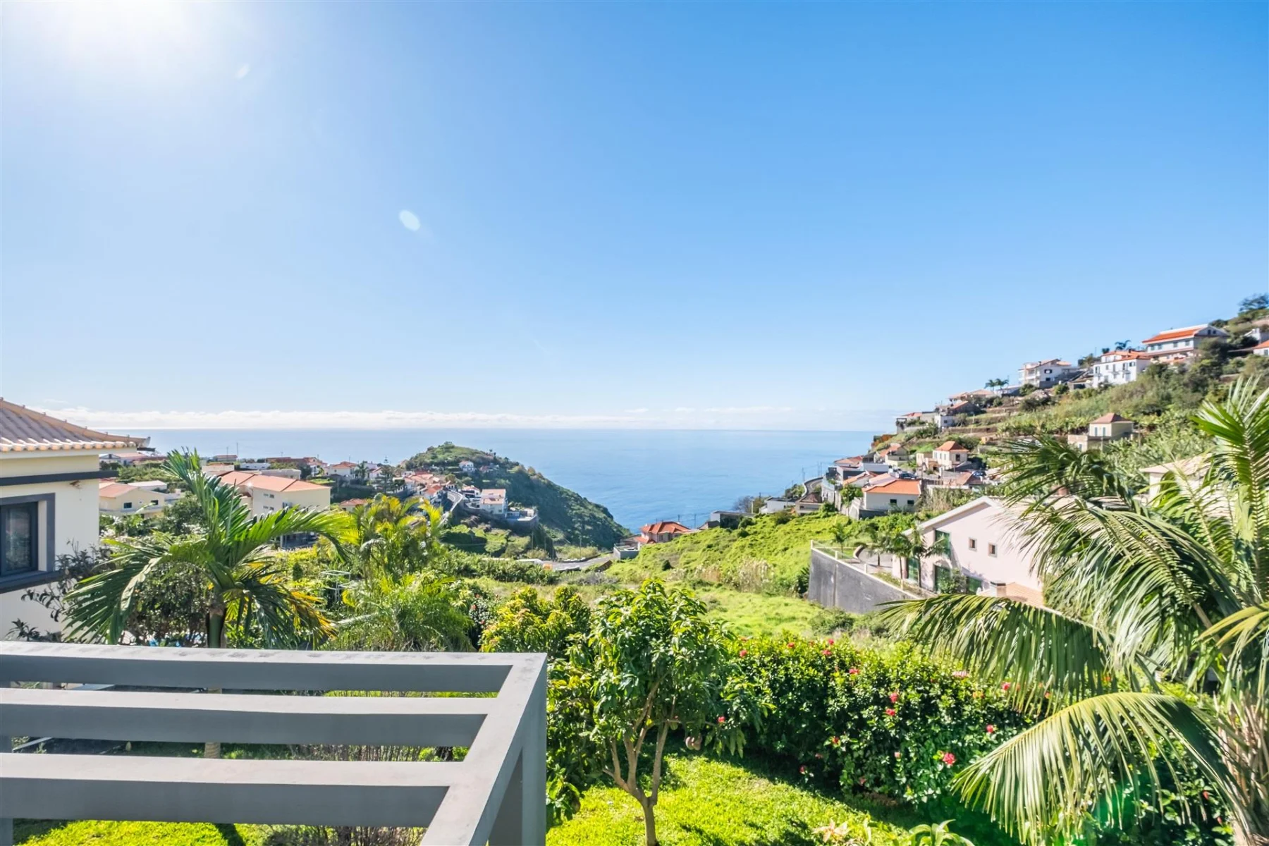 Stellen Sie sich vor, Sie erwachen jeden Morgen mit Blick auf den tiefblauen Atlantik, während die Sonne die sanften Hügel Madeiras in goldenes Licht taucht. Diese zeitgenössische Villa in der ruhigen Lage Banda de Além von Ribeira Brava macht diesen Traum zur Realität. Das südlich ausgerichtete Anwesen erstreckt sich über drei durchdacht gestaltete Etagen und verbindet modernen Wohnkomfort mit der einzigartigen Atmosphäre der Blumeninsel. Im Erdgeschoss empfängt Sie eine großzügige Garage mit Platz für bis zu acht Fahrzeuge sowie eine voll ausgestattete Außenküche mit Grillbereich, die zum geselligen Beisammensein unter freiem Himmel einlädt. Die erste Etage vereint Wohn- und Essbereich mit offener Küche, ergänzt durch ein Schlafzimmer und ein Badezimmer. Von der Veranda genießen Sie den atemberaubenden Panoramablick auf das Meer.