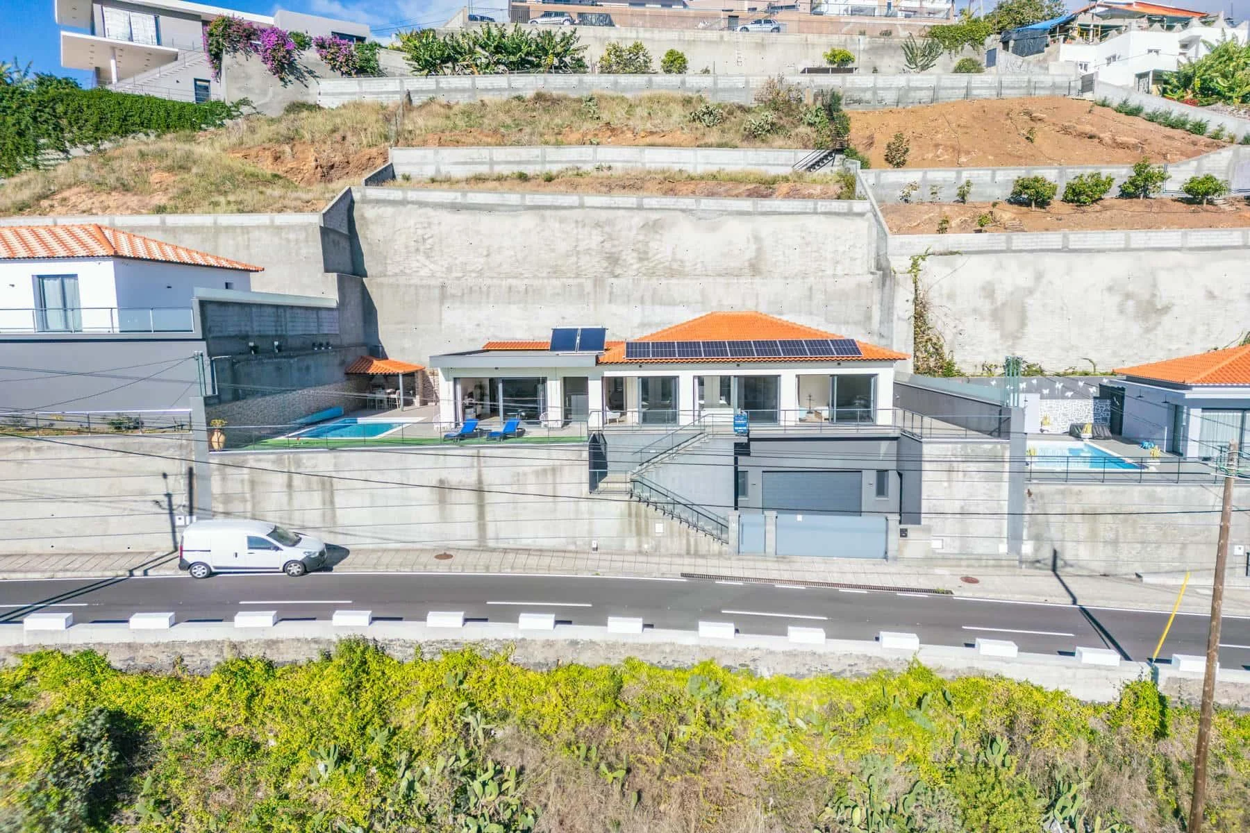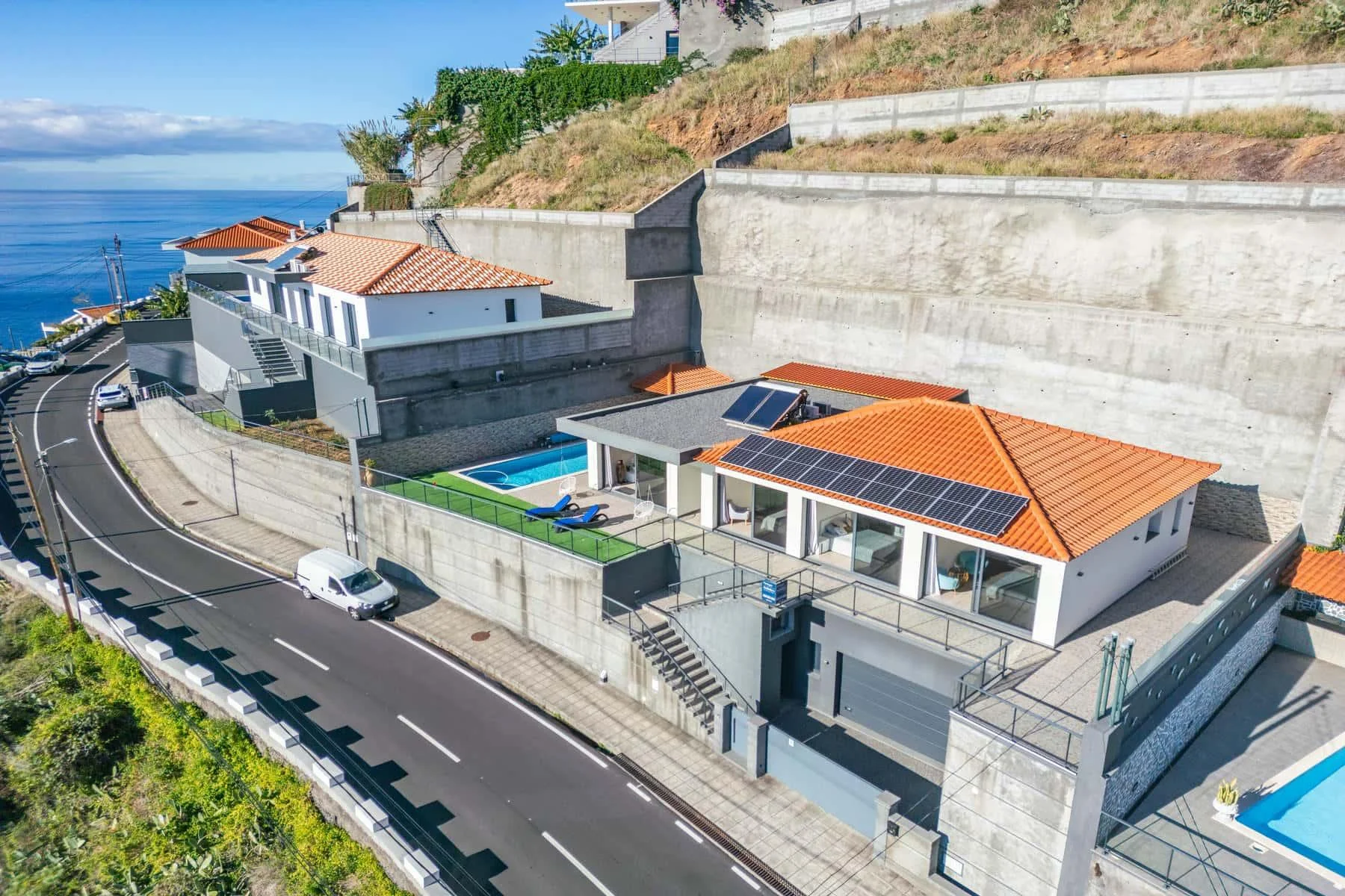 Die 2019 erbaute, eingeschossige Villa verbindet auf 247 Quadratmetern Wohnfläche großzügiges Raumgefühl mit durchdachter Funktionalität. Drei Schlafzimmer, jedes mit eigenem Bad und direktem Zugang ins Freie, schaffen ein Wohnerlebnis, das Innen und Außen nahtlos verschmelzen lässt. Die 26 Quadratmeter große Master-Suite bietet dabei ein Höchstmaß an Privatsphäre und Komfort. Insgesamt drei Badezimmer, ein funktionales Untergeschoss und Stellplätze für zwei Fahrzeuge runden das durchdachte Raumkonzept ab. Das 878 Quadratmeter große Grundstück entfaltet seinen besonderen Reiz im Außenbereich. Rund 250 Quadratmeter Freifläche mit großzügiger Terrasse, Veranda und einem Swimmingpool laden dazu ein, den Blick über den Atlantik und die Berglandschaft schweifen zu lassen. Dank der Ausrichtung nach Osten, Süden und Norden genießen Sie ganztägig Sonne –