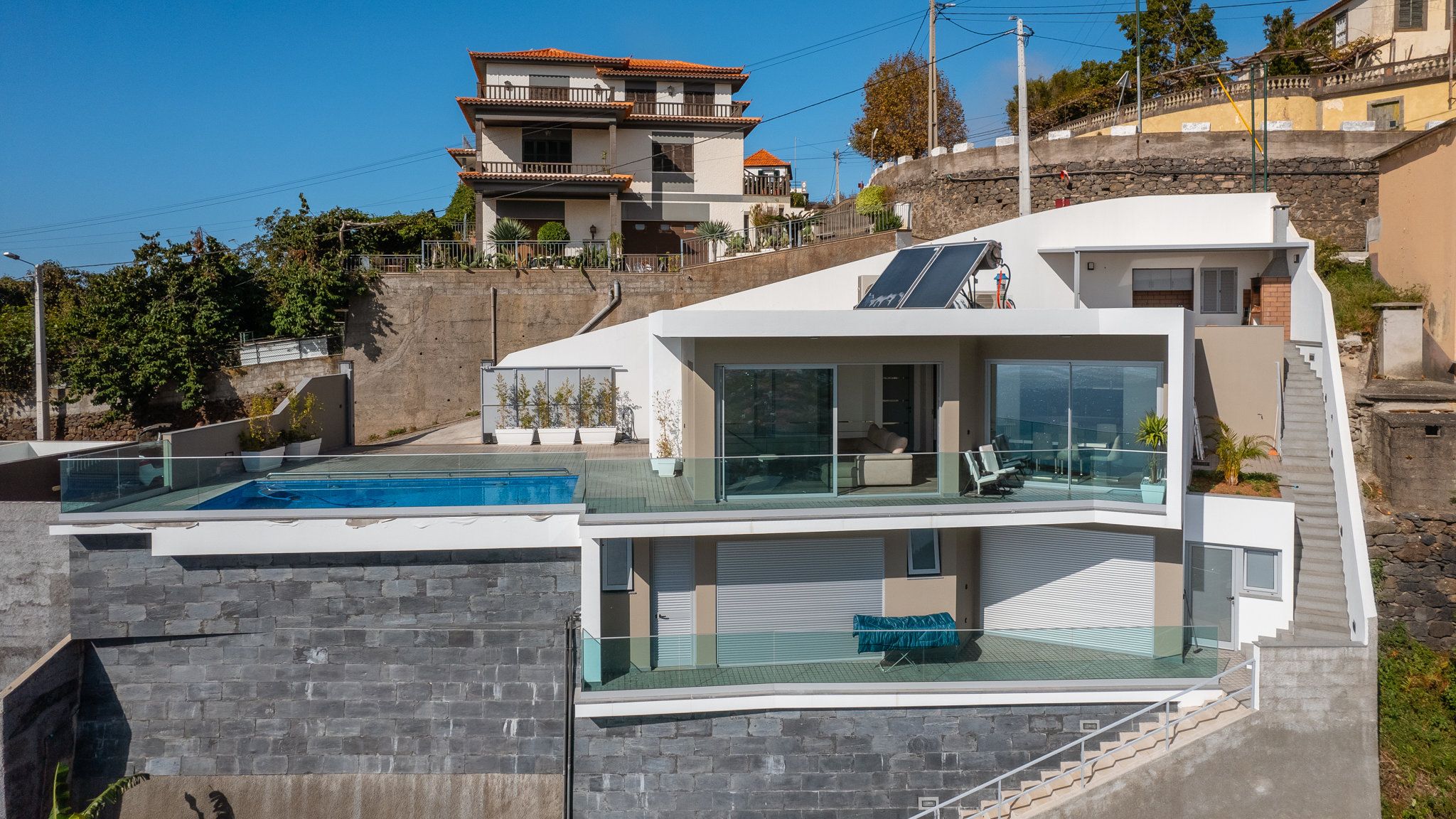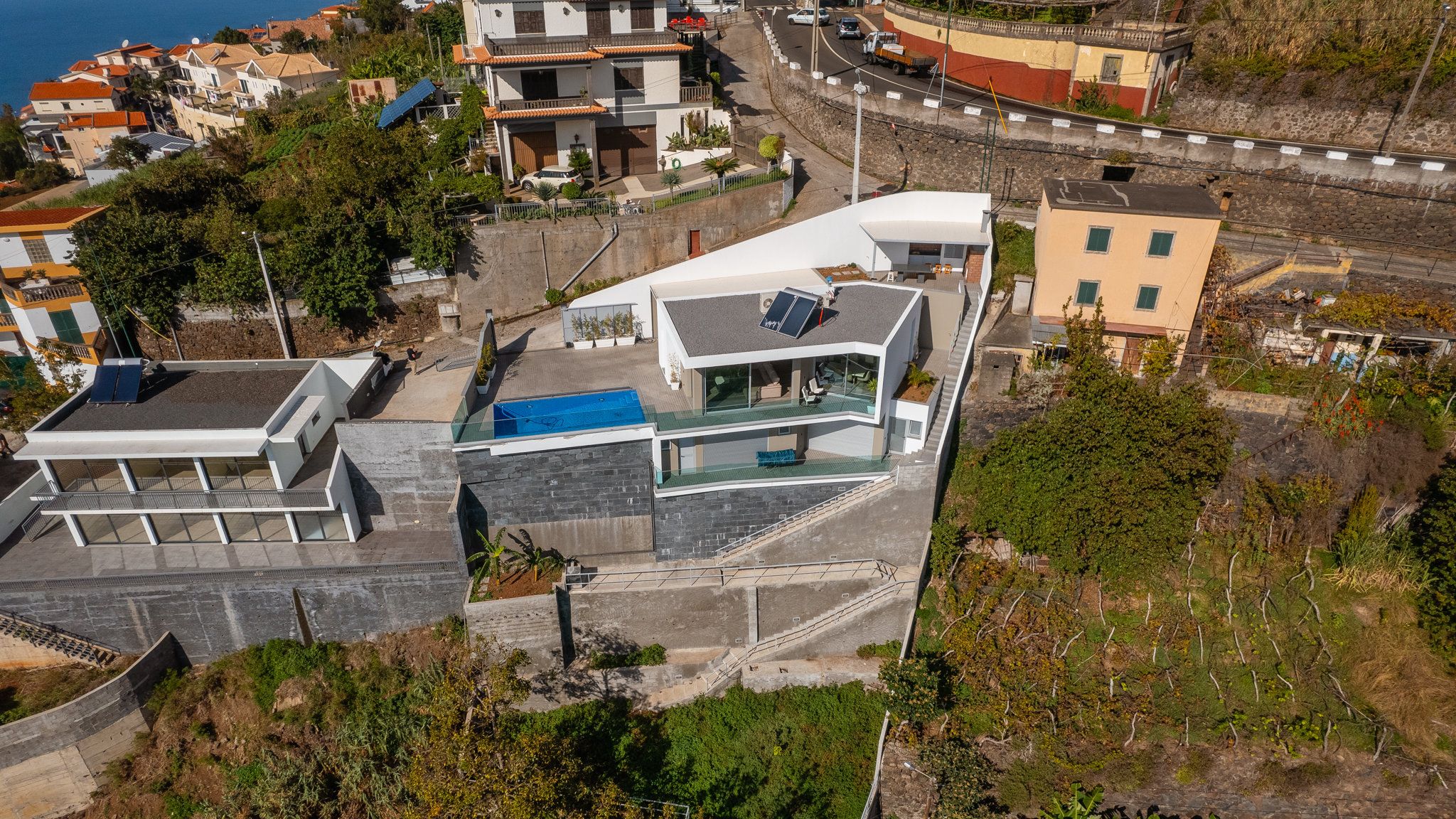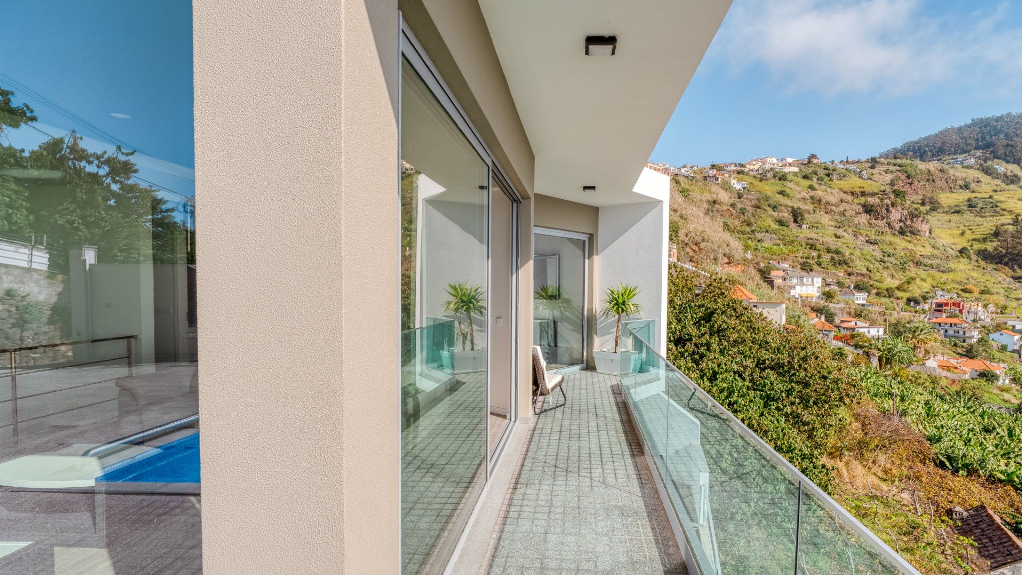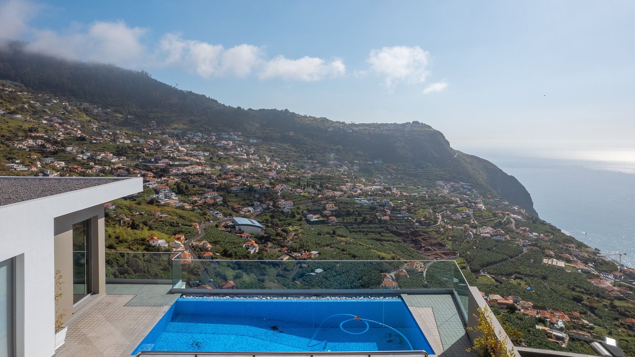 This beautiful villa is located on a quiet street with little traffic in Arco da Calheta. It is south-facing and offers wonderful views of the village and the Atlantic Ocean. The private driveway from the street leads to a forecourt with an adjoining covered parking space. The main entrance to the flat is accessed directly from here. The reception opens onto the living/dining area, which adjoins an open-plan, fully equipped kitchen.