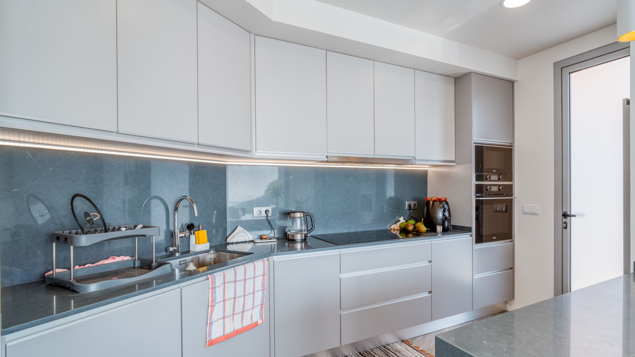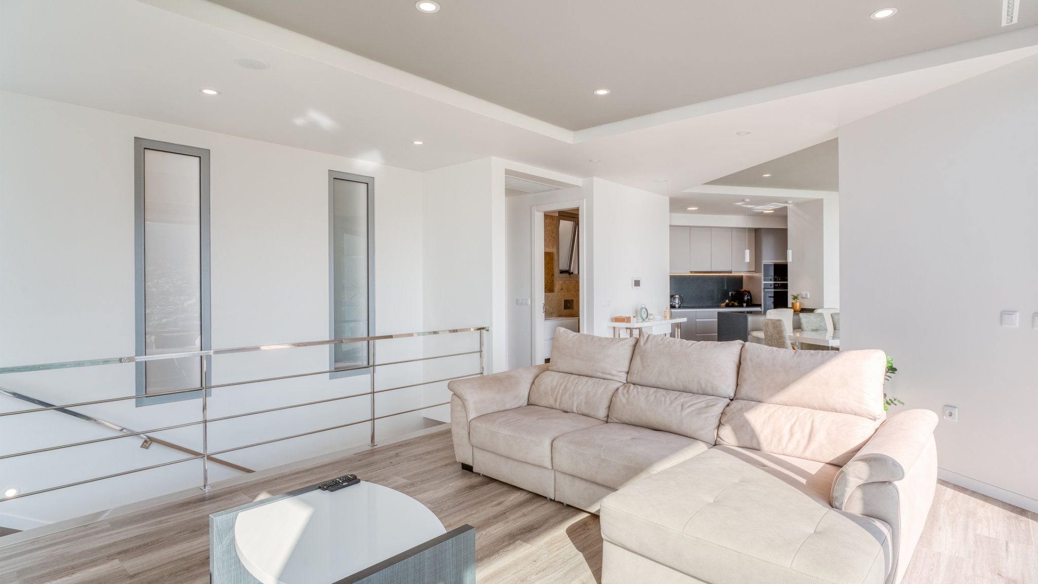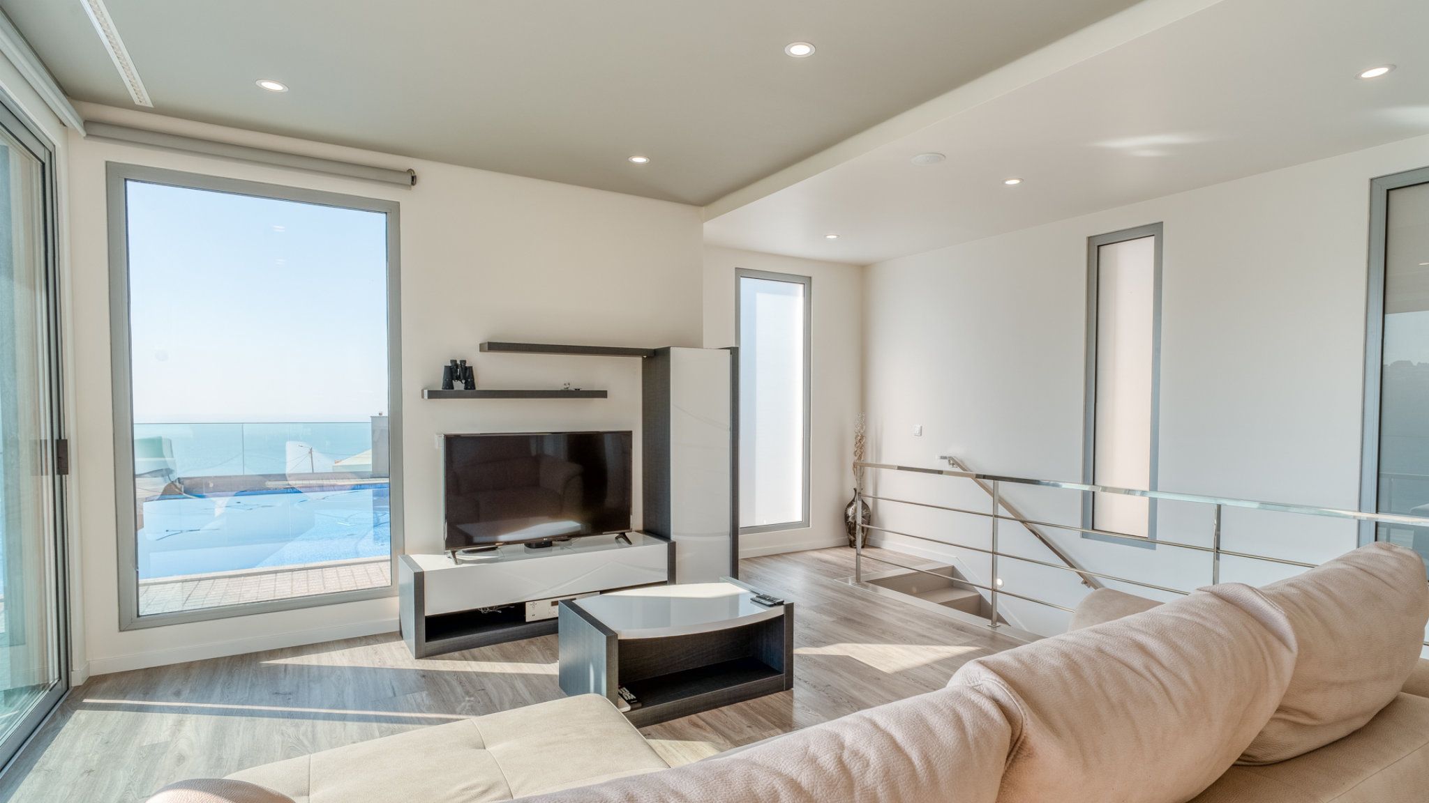 The floor-to-ceiling sliding glass doors allow an unrestricted view of the landscape and the sea from the entire living area. There is also a guest bathroom on the same level. On the lower level there are two bedrooms, each with a fitted wardrobe and an en-suite bathroom. The entrances and some of the interior doors are wheelchair-accessible with the appropriate width. Outside the villa there is a fantastic sun terrace with a fabulous infinity pool. Above the house there is a cosy BBQ terrace, also with a very beautiful view. The property also has a small natural garden, which can be reached via a staircase.