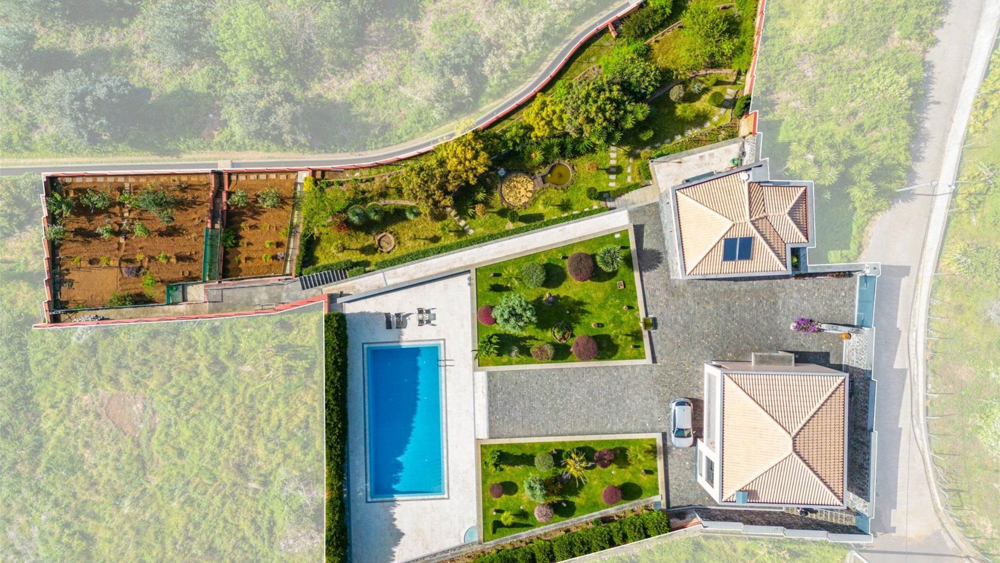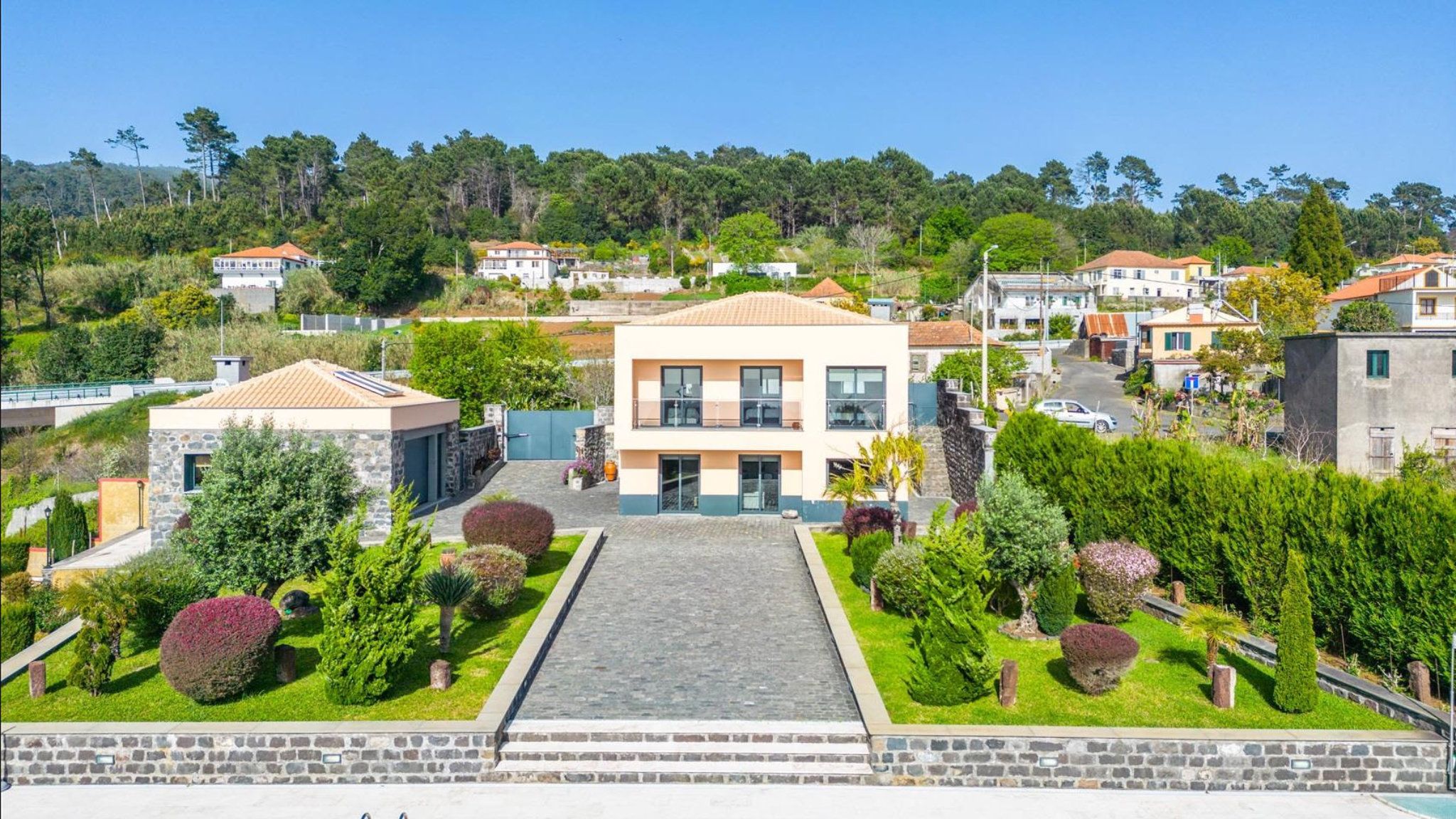 This brand new luxury villa was completed in 2022 and offers beautiful views of the surrounding countryside. It is located in a privileged residential area of Fajã da Ovelha. The exclusive property is characterised by its elegance, generous room layout and beautiful outdoor facilities. These consist of a fantastic pool with surrounding sun terrace, a beautifully landscaped subtropical garden and a kitchen garden.