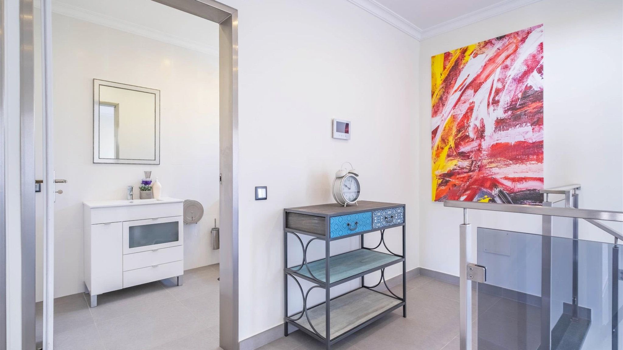 The pure living area of 162 m2 is distributed as follows: an elegant living/dining room, kitchen and guest bathroom on the ground floor. Upstairs there are three bedrooms with fitted wardrobes. The master bedroom has an en suite bathroom and access to a very nice balcony. Next to the main building is the large garage, which offers space for several vehicles. The garage is also converted into a party room with barbecue and bar, inviting housemates and guests to spend the long summer evenings outdoors. The property is conveniently located. The nearest motorway can be reached within a few minutes.